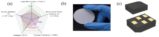 图1 (a)超宽禁带半导体的优越物理特性;(b)2寸氧化镓外延薄膜;(c)射频滤波模块。