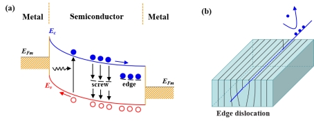 图3(a)带隙中位错引入的能级示意图和(b)刃位错作为电子散射中心的示意图。