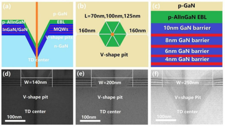 图2. InGaN基红光LED外延结构示意图及透射电子显微镜照片。